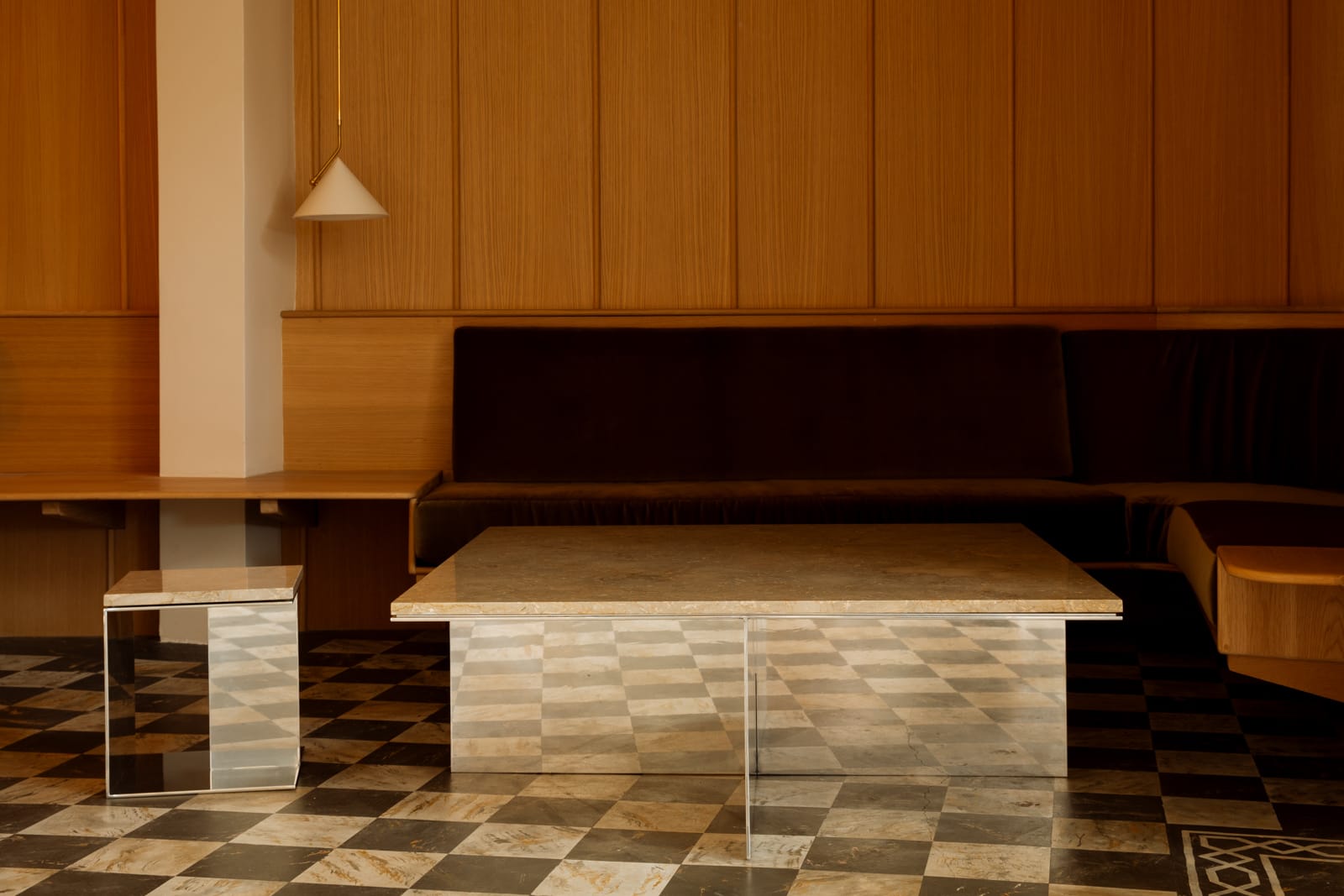 Material Studies II revisits the Cube + Void collection, recasting its reductive designs in mirrored aluminum and richly pigmented stone, marking Kalon’s first use of stone. Redesigned in response to these materials, the forms shift in proportion and construction, refining mass into tensile profiles and introducing new weight and density.