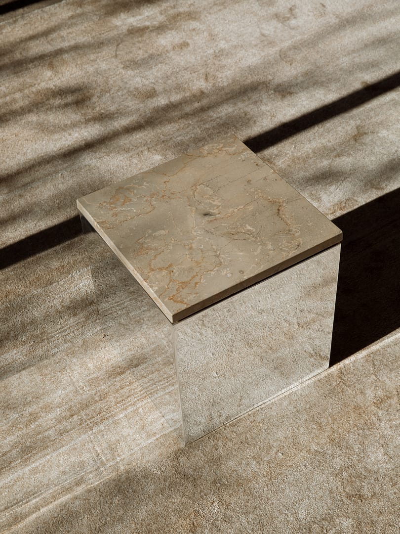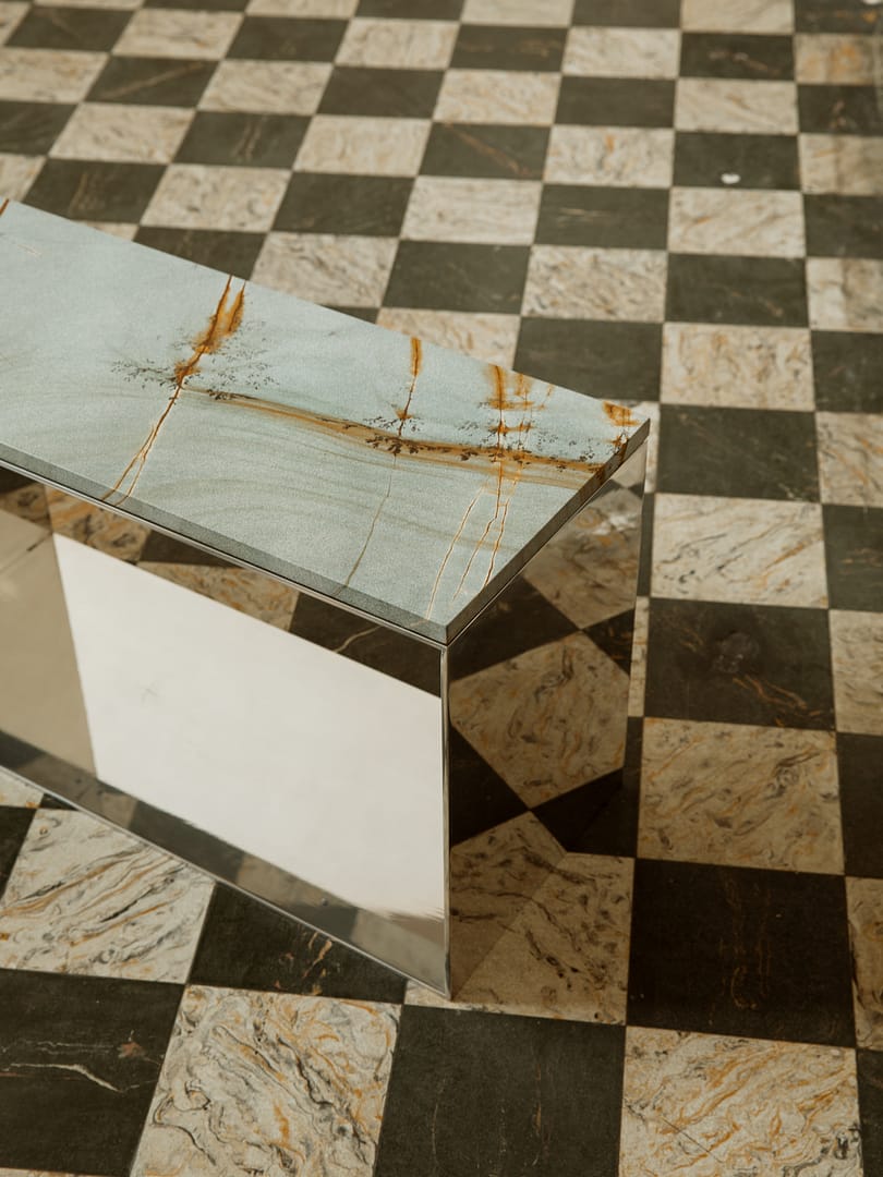Vibrant and reflective, the collection plays with illusion and depth. The mirrored planes place each piece in dialogue with its surroundings and, when positioned together, reflect one another, creating a subtle confusion of depth and mass. Volume shifts and edges dissolve, while stone asserts density and tonal richness. The material shift alters how each object lives in a room—at times quiet and integrated, at others commanding and central.