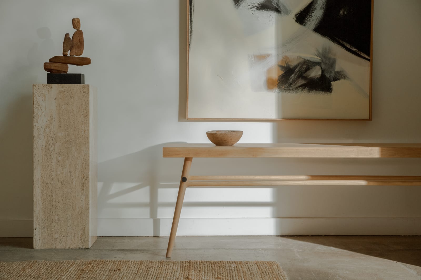 The Bough Bench is constructed of solid American hardwood (Ash, Walnut, or White Oak) featuring complex, concealed joints of surprising strength and blackened steel hardware detailing on the cross beam. Designed as seating, to command a space on its own, or as a long coffee table. Wood is hand-rubbed and finished with Kalon Bare Finish, a natural oil/wax finish painstakingly developed to preserve the delicate and luminous beauty of raw wood.