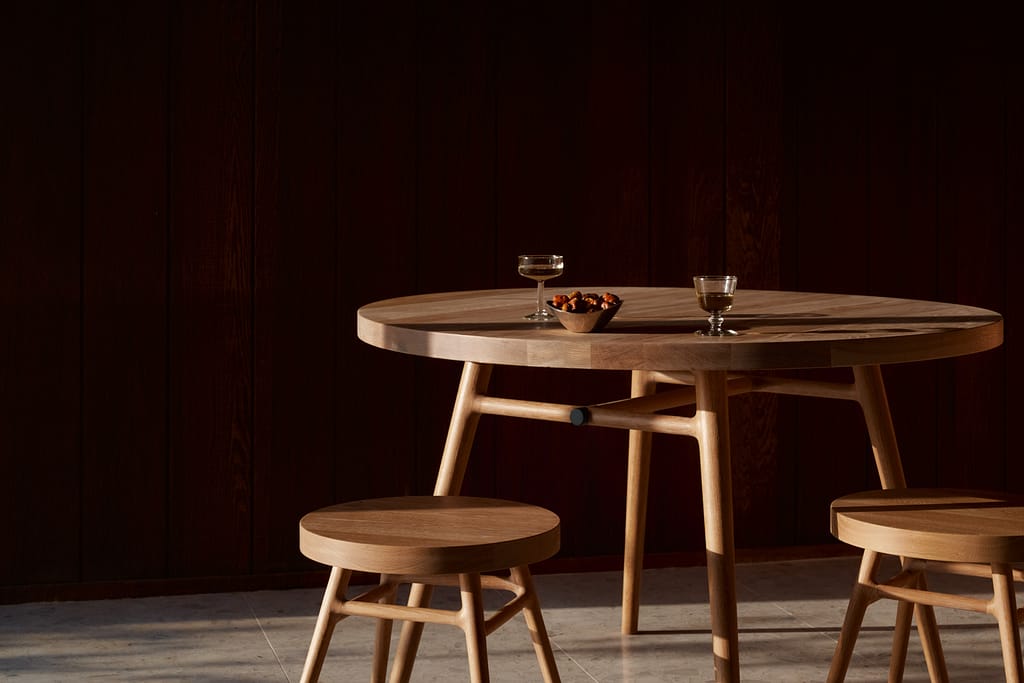 The Bough Table Round is a trestle-style table constructed of solid American hardwoods (Ash, Black Walnut, and White Oak). Features complex, concealed joints of surprising strength and blackened steel hardware detailing on the cross beam. Our first round table, this design is intended to work in less formal dining spaces and smaller interiors. Available in two sizes. Wood is hand-rubbed and finished with Kalon Bare Finish, a natural oil/wax finish painstakingly developed to preserve the delicate and luminous beauty of raw wood.