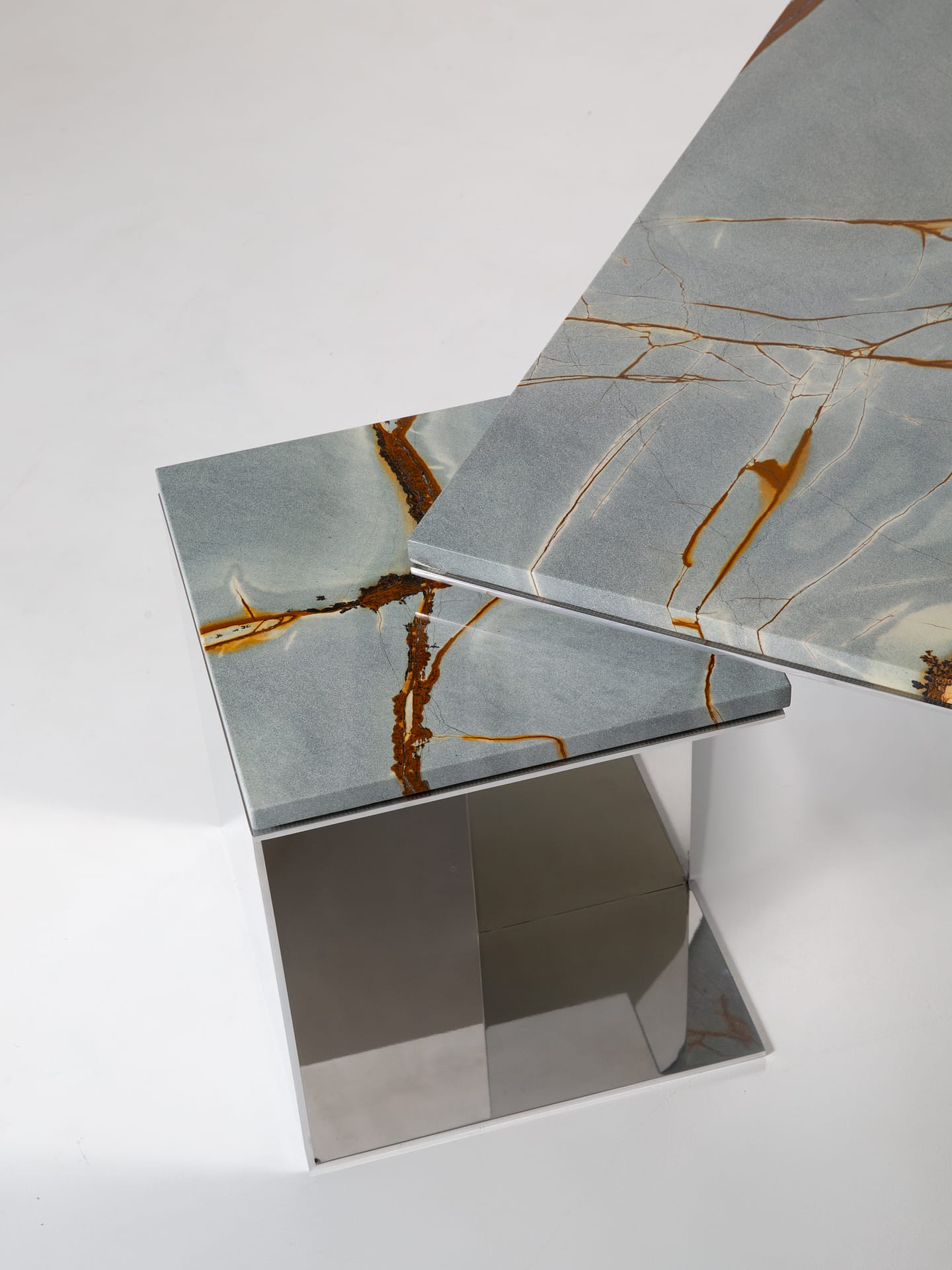 The mirrored base captures and refracts its surroundings, pulling light, color, and movement into its surface. As the day shifts, edges extend and dissolve, subtly altering the perception of depth and mass. Above, richly pigmented stone—high‑gloss, veined, and saturated—introduces weight and tonal variation. Reflection and density operate in tension, the luminous metal amplifying its environment while the stone grounds the composition with presence.