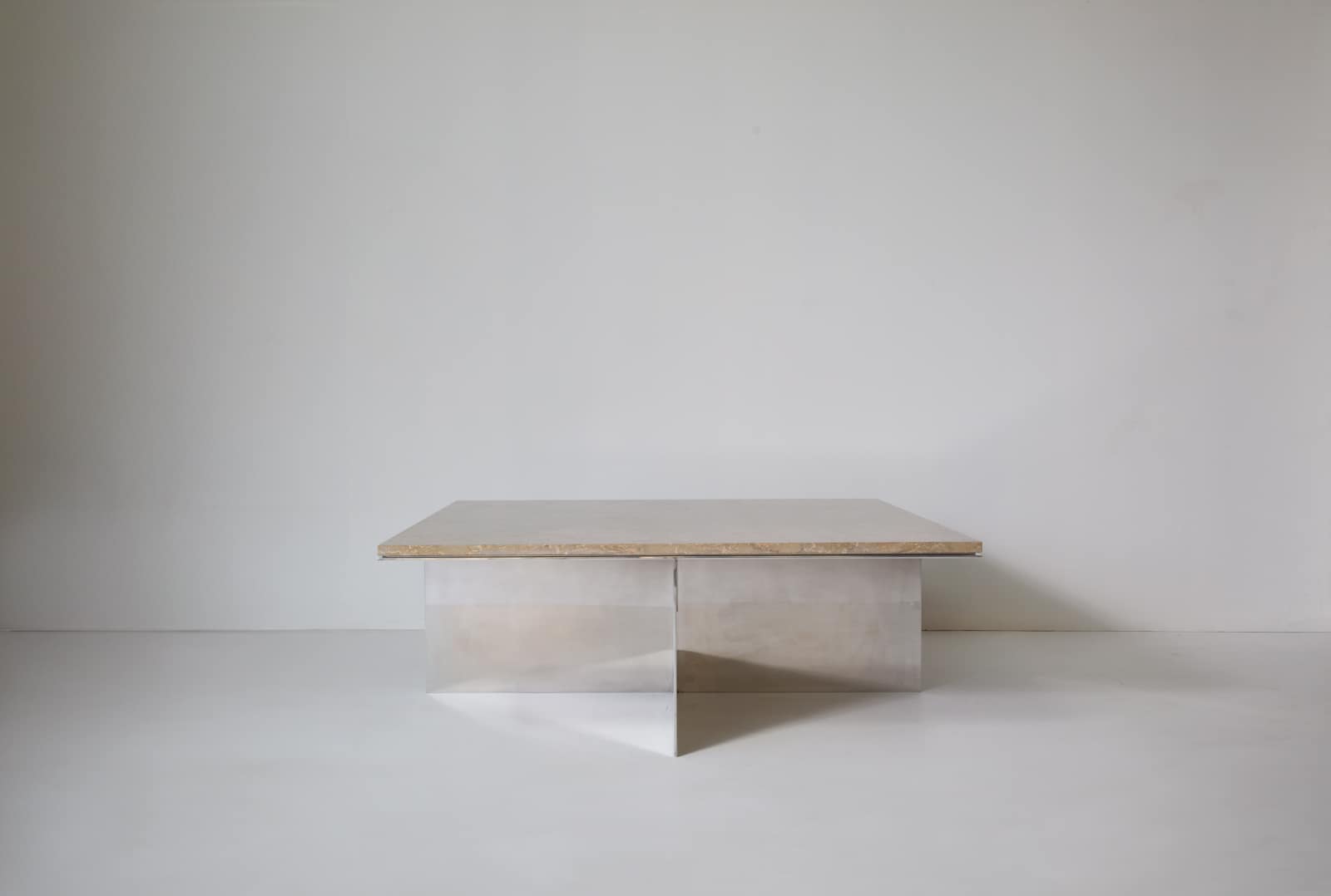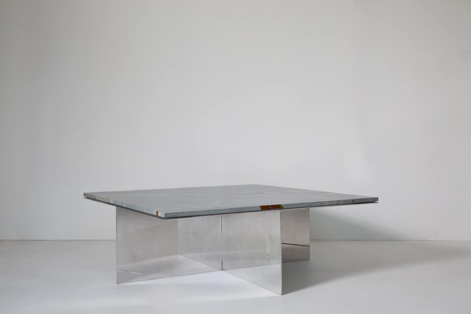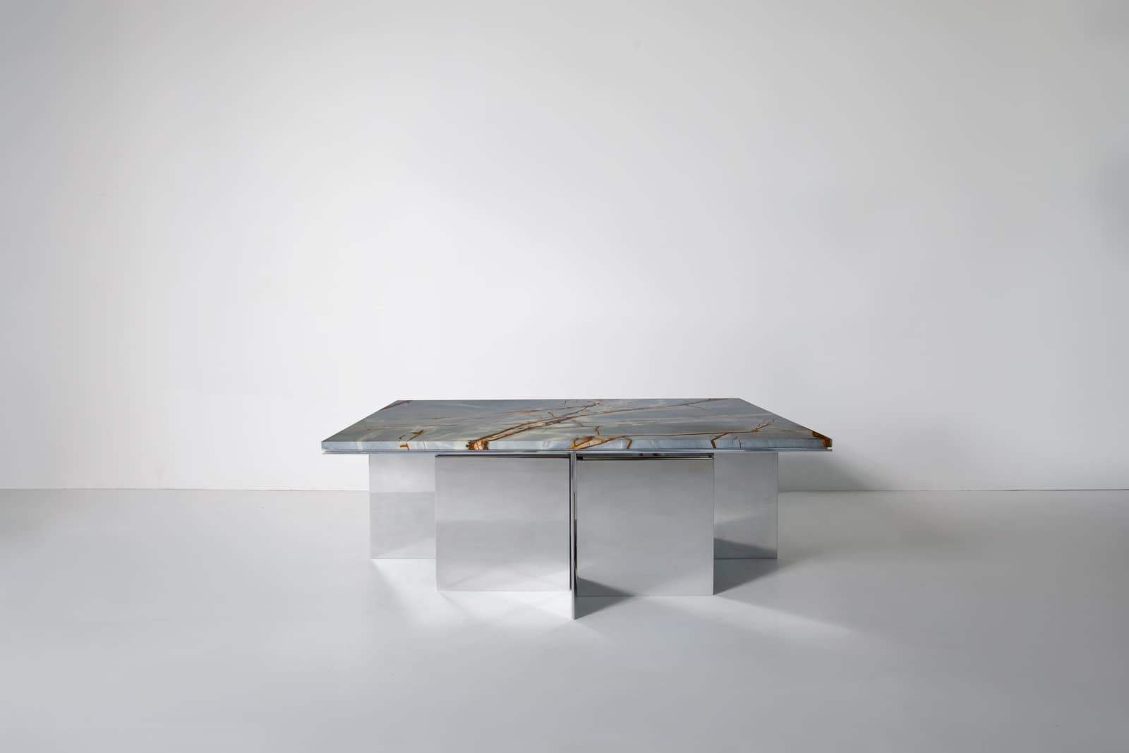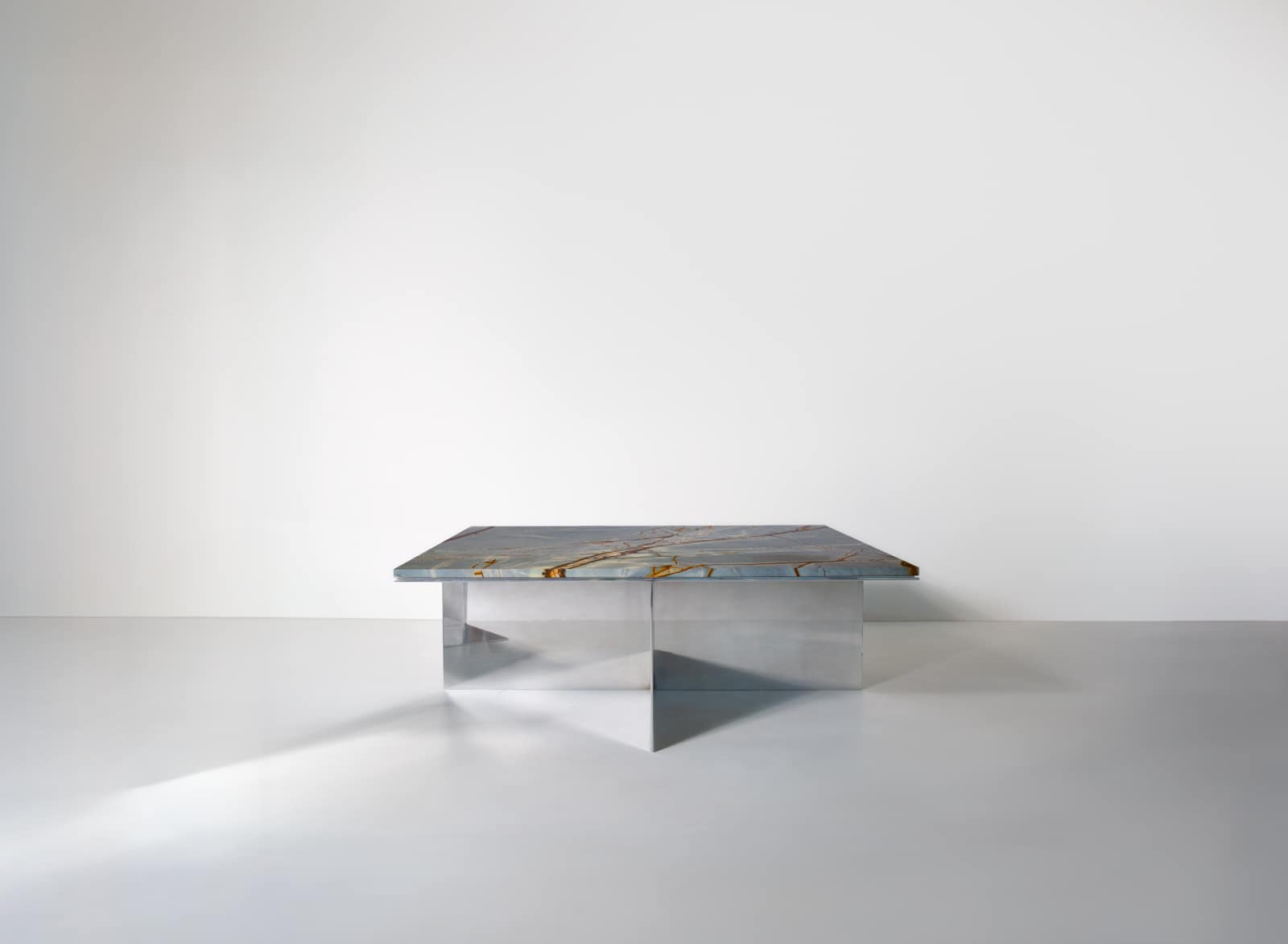 The Material Studies II Coffee Table pairs a mirrored aluminum base with a substantial slab of quartzite or marble. A simple, symmetrical X‑leg establishes its stance, its slender silver frame tracing a precise outline beneath the stone.