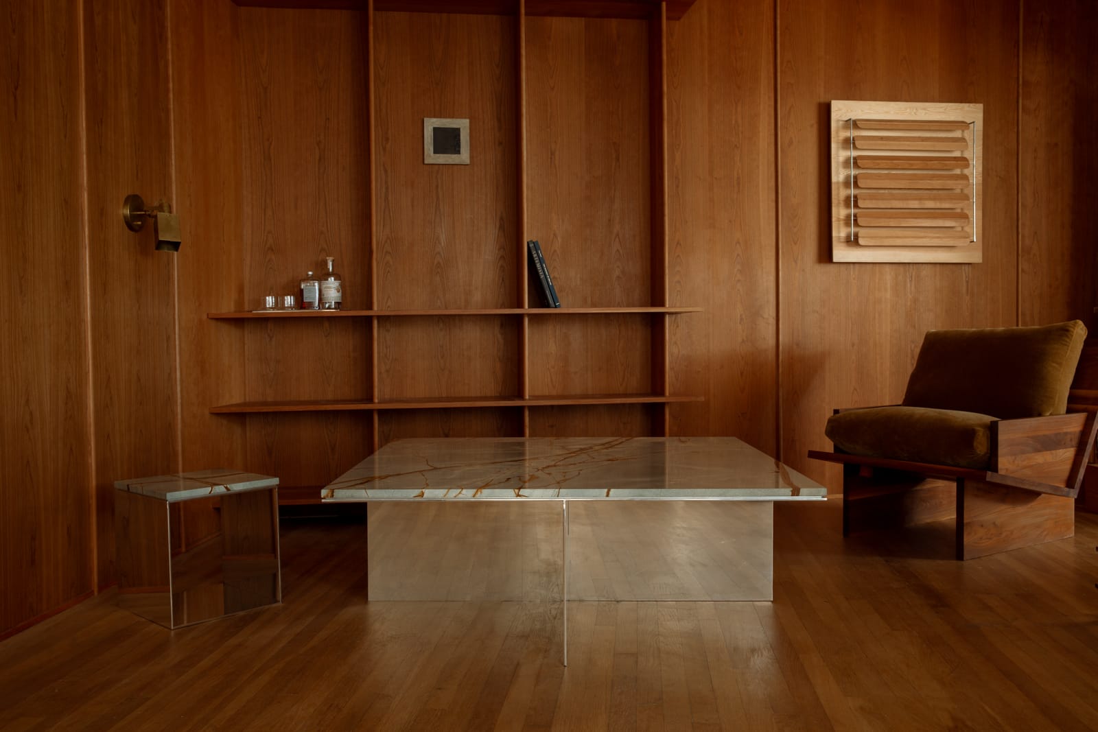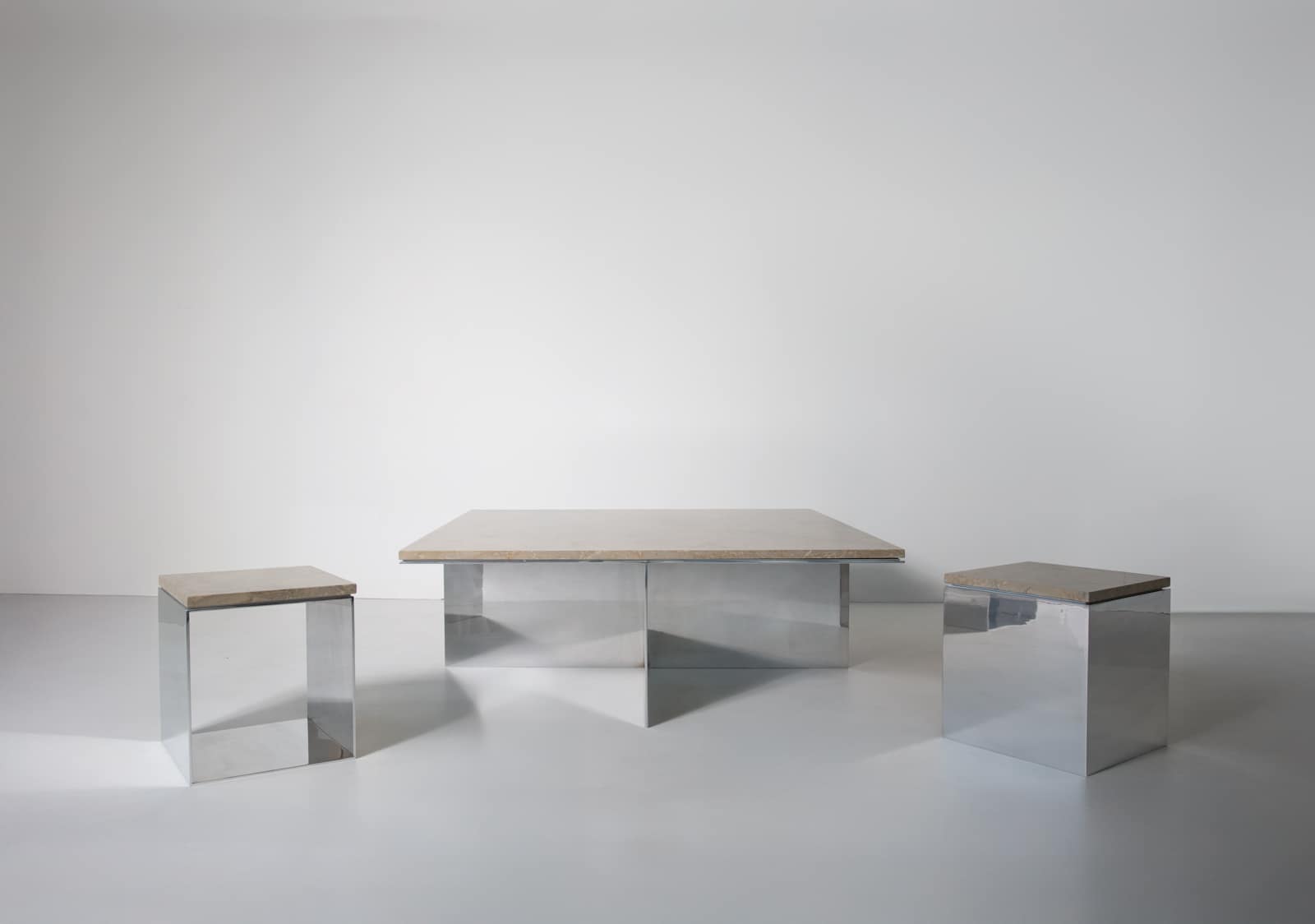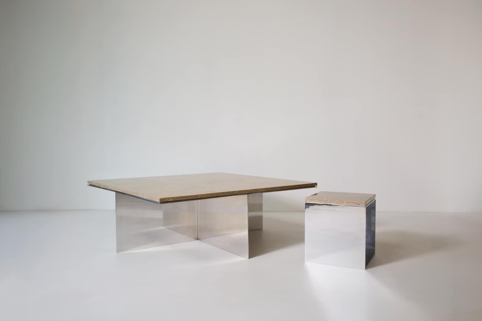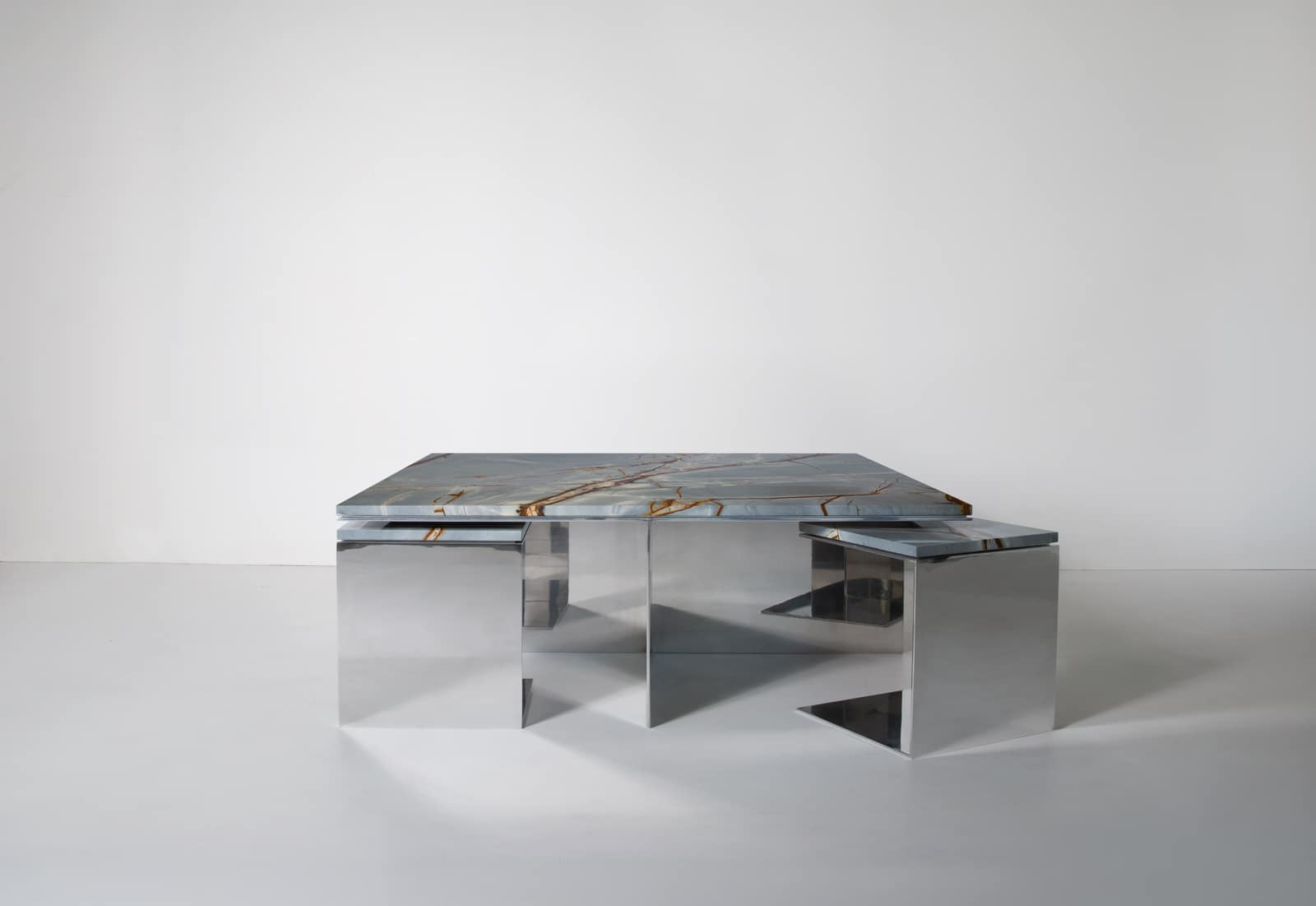The Material Studies II Coffee Table pairs a mirrored aluminum base with a substantial slab of quartzite or marble. A simple, symmetrical X‑leg establishes its stance, its slender silver frame tracing a precise outline beneath the stone.