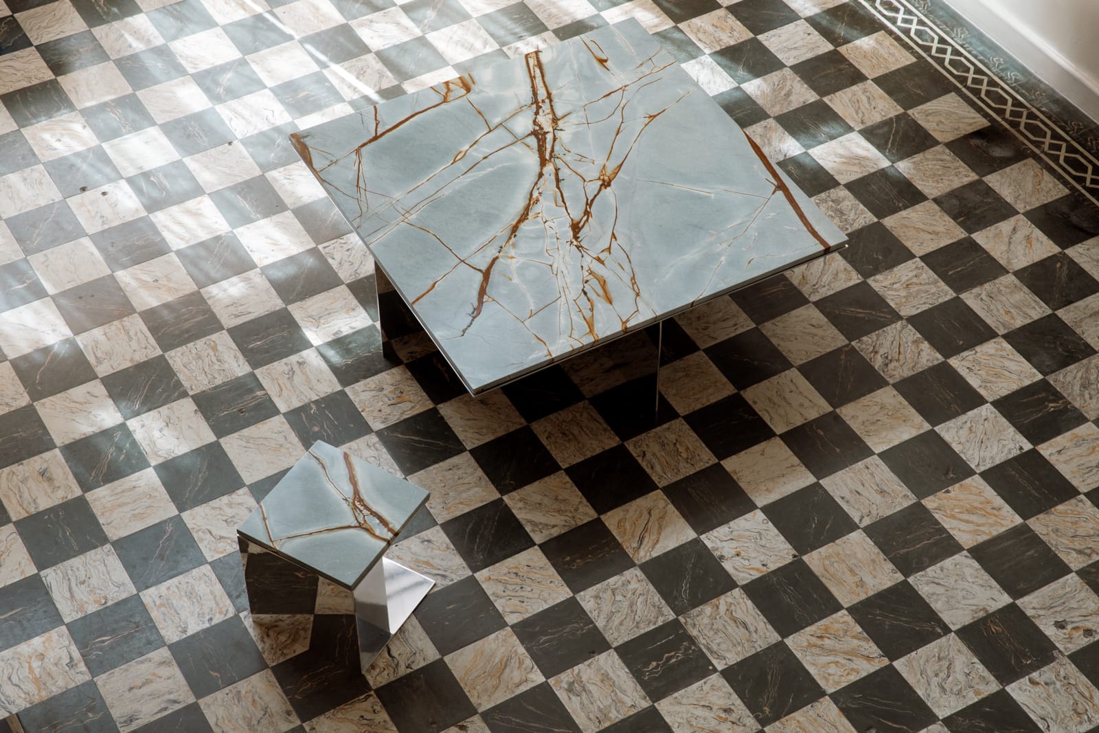Composed and exacting, the table defines its space. Its distinctive contrast of silvered aluminum and deeply colored stone sets it apart as a singular work—considered, crafted, and made to remain.
