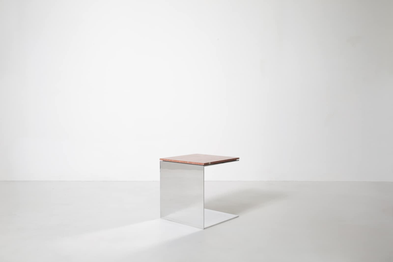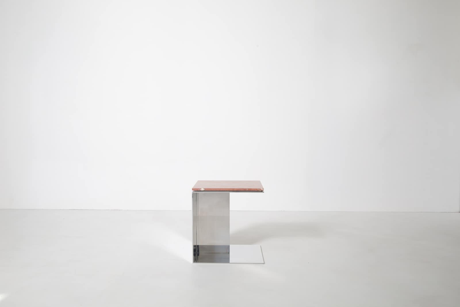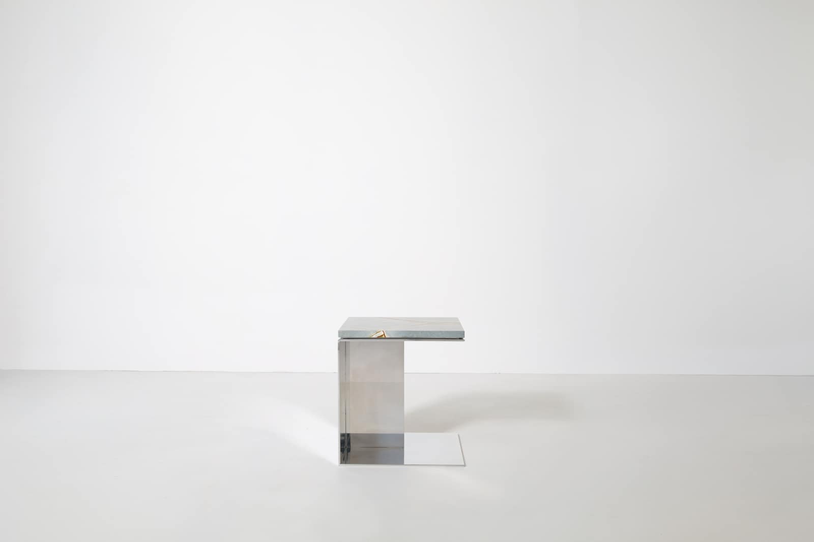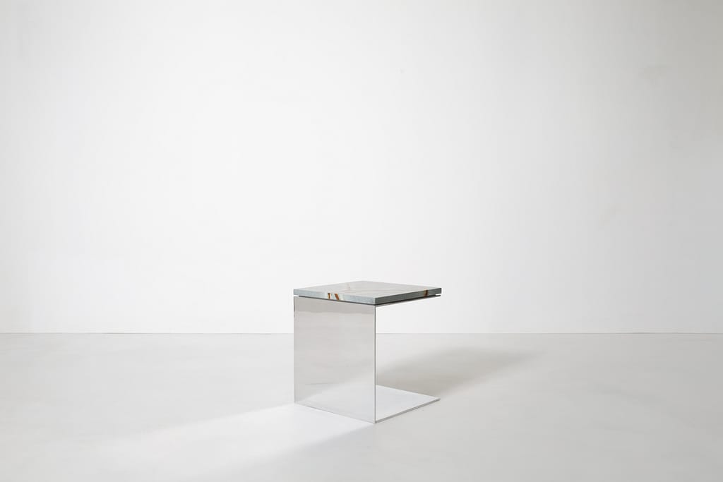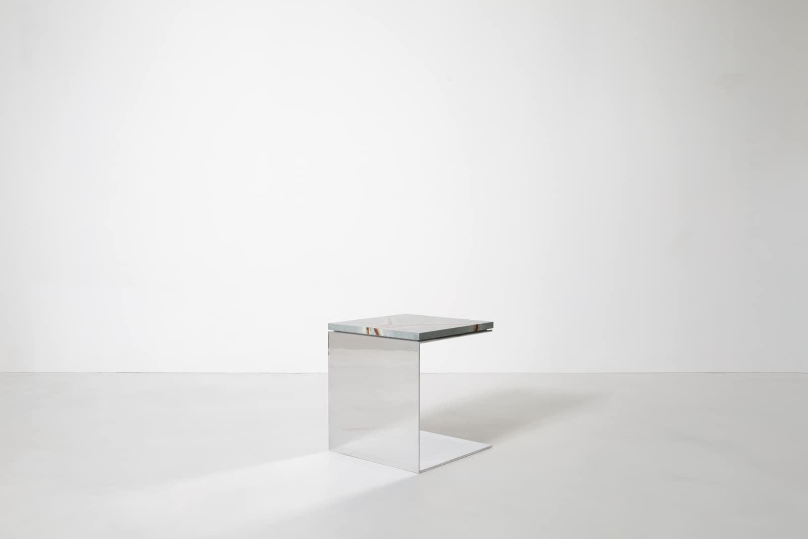 The Material Studies II Cubes translate the collection’s dialogue between reflection and density into a more compact scale. Each variation pairs mirrored aluminum with a richly pigmented stone top, forming a precise, elemental volume. Open on three sides, v.3 reduces the form to a single plane and base, emphasizing negative space.