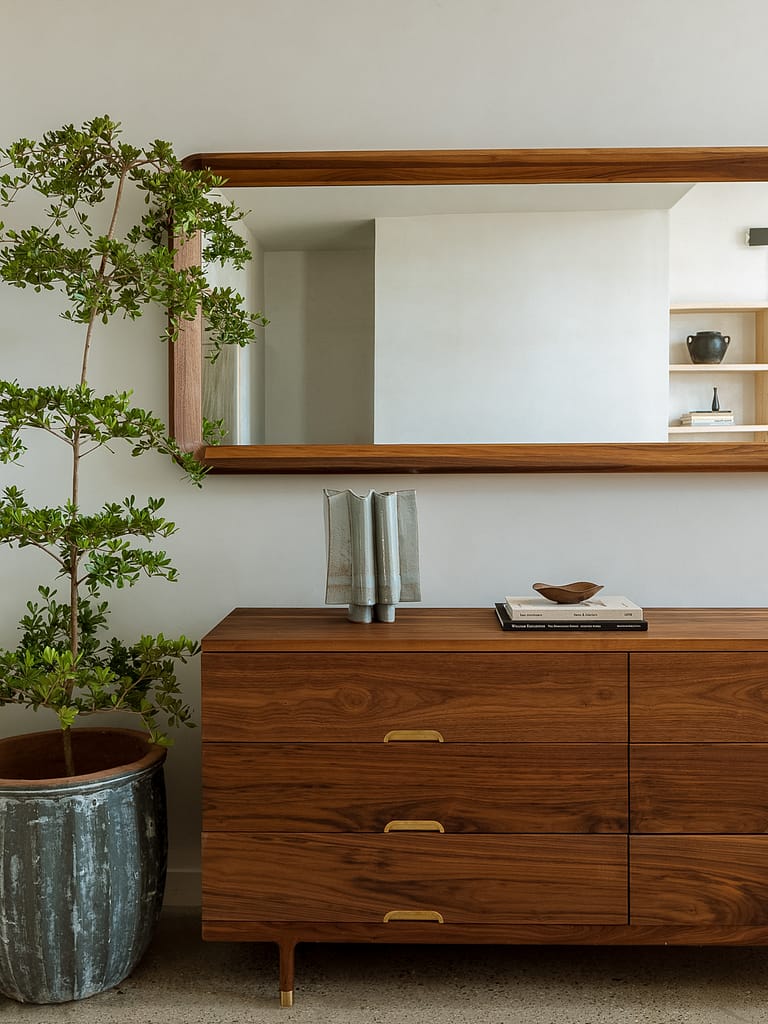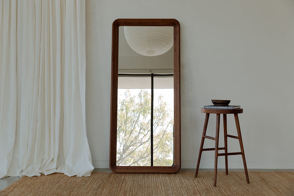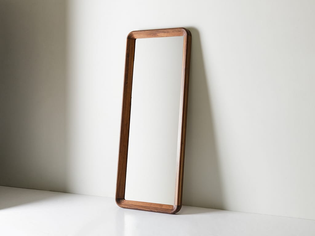 The Simple Collection explores living materials, purity of form and the quiet beauty of private spaces. The Simple Mirror is a large scale, 6-foot mirror with a solid, oil-rubbed, hardwood frame. The mirror can be hung in two orientations or casually lean against a wall. With its chamfered interior edges and soft, rounded corners, the pieces highlights the beauty of natural grain structure. The unobtrusive beauty of the piece makes it ideal for any room in the house. Available in Black Walnut, Ash or White Oak. Available in custom species or built to custom spec upon request.